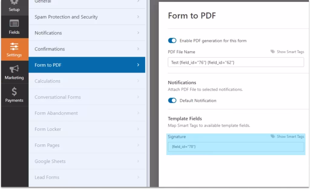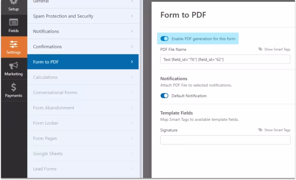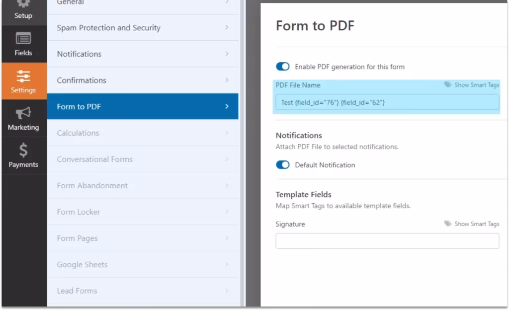 Next is naming PDF file – WPForms Smart Tags are available if you wish to insert data from the field’s into the name.