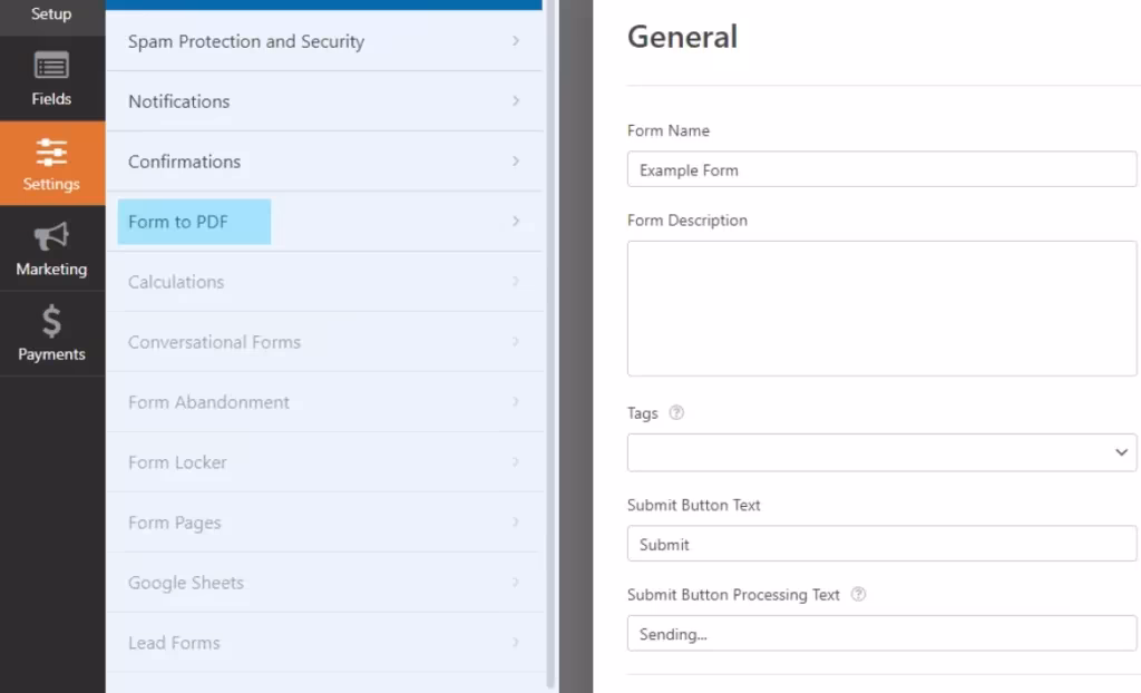 To start open form’s editor and navigate to “Form to PDF” in Settings.